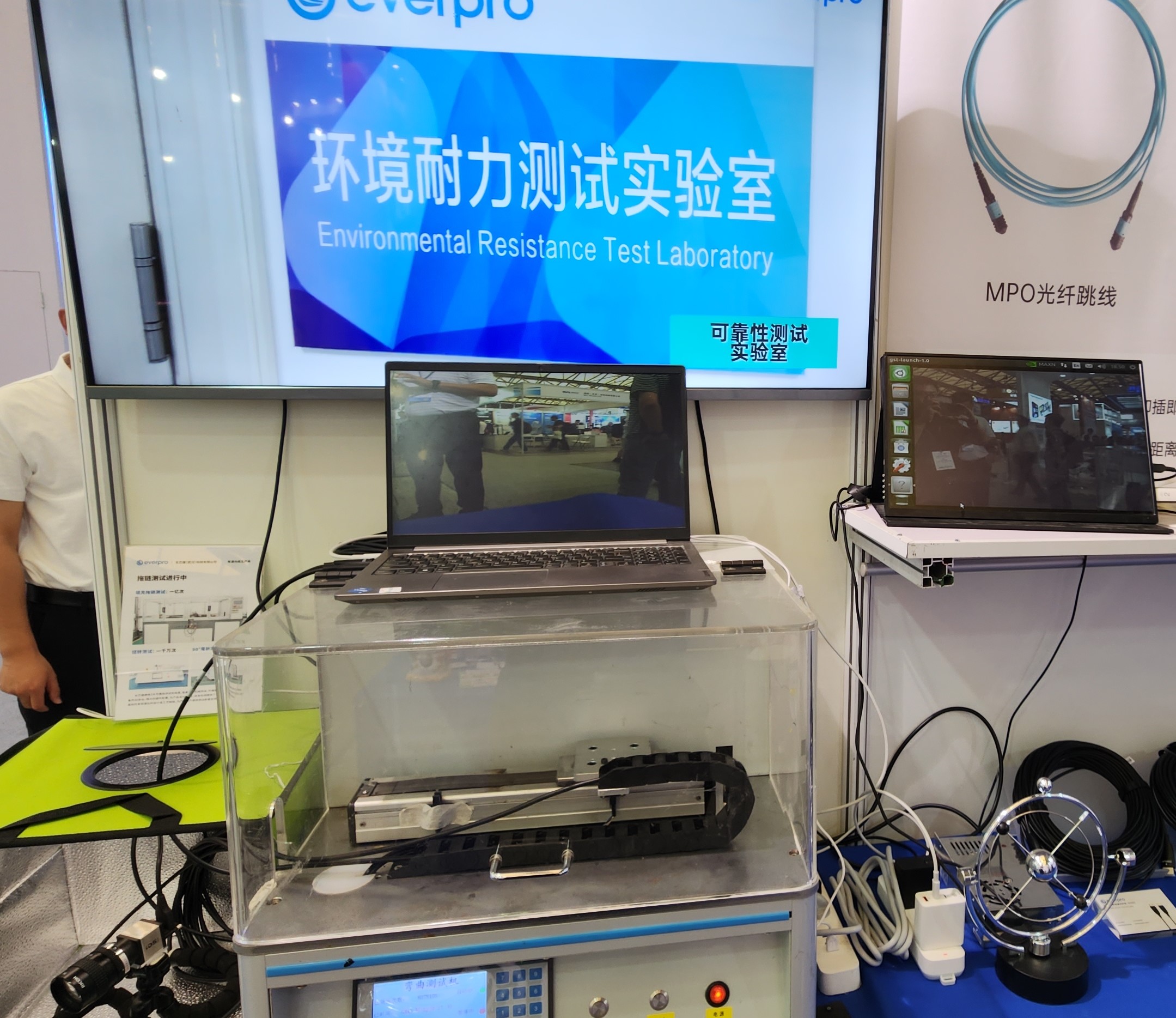 为了让参展嘉宾近距离感受有源光缆的魅力,俄罗斯专享会将只在实验室出现的高速坦克链测试仪搬到展会现场,并用机器人混合光纤数据线连接MIPI相机与笔记本电脑,搭建出实时拍摄的应用环境,动态展示俄罗斯专享会有源光缆优异的性能与品质。
